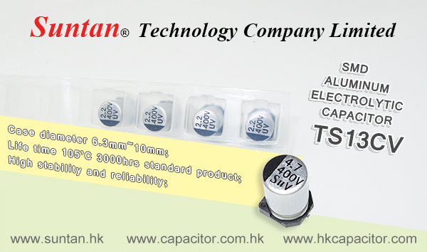 Suntan’s TS13CV is a SMD typed aluminum electrolytic capacitor series with 105’C operating temperature, 3000hrs long life.