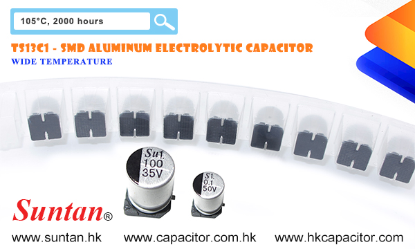 Suntan’s TS13C1 is a SMD typed aluminum electrolytic capacitor series with -55~+105’C operating temperature range.